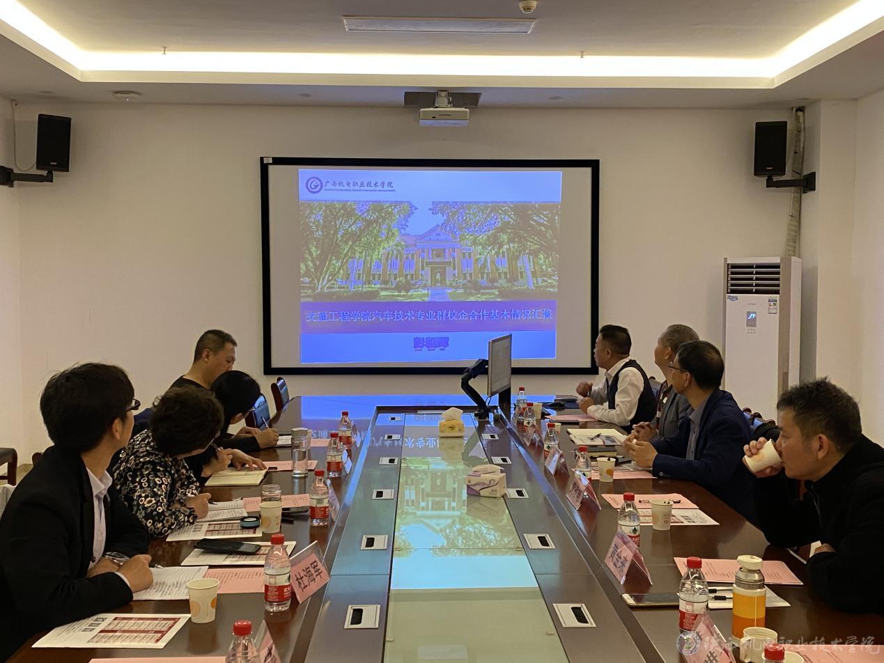 黄政艳致欢迎辞,介绍了广西机电职业技术学院发展历程、专业布局、发展愿景、校企合作等情况;徐圣月对黄政艳等的热情接待表示感谢,介绍了我校专业设置、新校区建设、校企合作等情况。汽车工程系大师工作室负责人、国家教学名师彭朝晖做了交通工程学院汽车技术专业群校企合作情况报告,并就吉利产业学院建设进行汇报讲解;与会人员还就工学交替、人才培养、双高建设、产业学院建设等情况进行交流探讨。