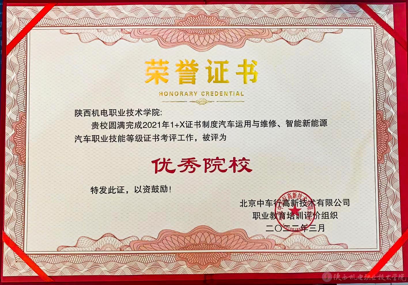 近日,我校汽车工程学院收到“1+X”汽车专业领域职业技能等级证书评价组织—北京中车行高新技术有限公司发来的荣誉证书,祝贺我校圆满完成2021年1+X证书制度汽车运用与维修、智能新能源汽车职业技能等级证书考评工作,成绩优异,被评为“优秀院校”。