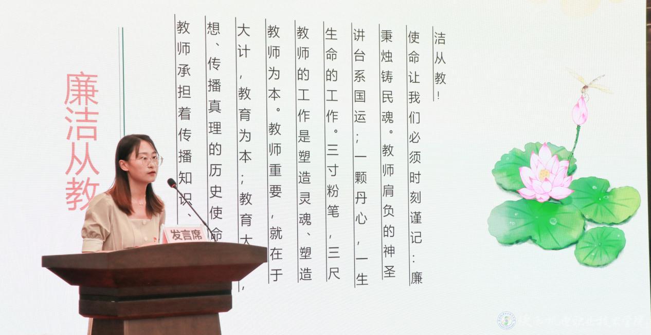 参赛选手们高度重视,准备充分,紧紧围绕“树清风正气、建清廉校园”主题,结合立德树人、廉洁传承,声情并茂地讲述着廉洁故事和先进事迹,从不同角度和层面诠释了对“廉洁”的深刻理解。演讲作品中有弘扬廉洁文化、筑造廉政中国的逐梦之旅,有歌颂廉洁奉公典范人物的华彩篇章,有潜心育人、彰显廉洁情怀的铮铮誓言,也有对营造廉洁校园文化的思考与凝炼,充分展示了我校教师党员充满理想激情、积极奋发进取的精神风貌。演讲过程中,选手们时而激情澎湃,时而舒缓动情,他们以饱满的热情,昂扬的精神状态,满腔的热忱给在场观众带来一次又一次精神上的洗礼,引得现场听众强烈的震撼和共鸣,博得了阵阵掌声。