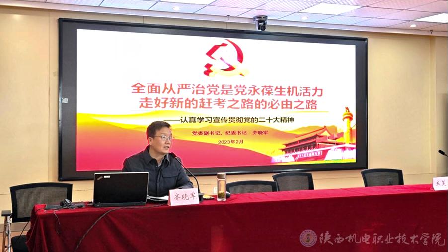 2023年2月2日下午,学校党委副书记、纪委书记齐晓军在宝福路校区汽车机电大楼四楼视频会议室讲授《全面从严治党是党永葆生机活力、走好新的赶考之路的必由之路》专题党课,基础部党支部、经管与艺术学院党支部所辖部门全体教职工、纪委委员、纪检委员等60多人参加,纪委副书记、纪律检查室主任王芙蓉主持会议。