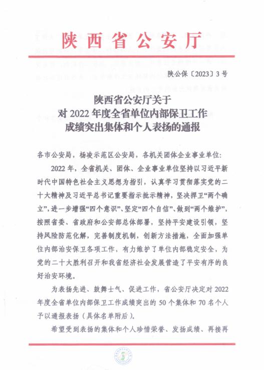 近日,陕西省公安厅发布了《陕西省公安厅关于对2022年度全省单位内部治安保卫工作成绩突出集体和个人表扬的通报》,我校保卫处喜获“全省单位内部治安保卫工作成绩突出集体”荣誉称号,同时获得宝鸡市公安局金台区“2022年度治安重点单位先进集体”,保卫处副处长常小凯同志被评为“2022年度金台区治安重点单位保卫工作先进个人”。