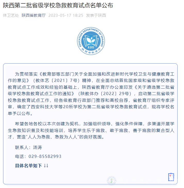 5月17日,陕西省教育厅公布了第二批省级学校急救教育试点单位名单,买球赛的app官网成功入选。
