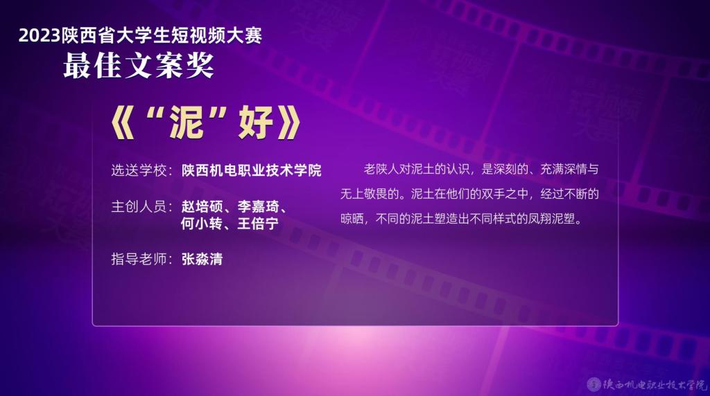 近日,由陕西省委网信办指导,西安市委网信办、当代融媒体研究院主办,陕西网承办的2023陕西省大学生短视频大赛颁奖典礼在西安交通大学兴庆校区举行。由我校铁道工程学院张淼清老师指导,21软件技术2赵培硕、22人工智能李嘉琦、22铁道运管2何小转、21网络技术1王倍宁四位同学主创作品《“泥”好》荣获最佳文案奖。