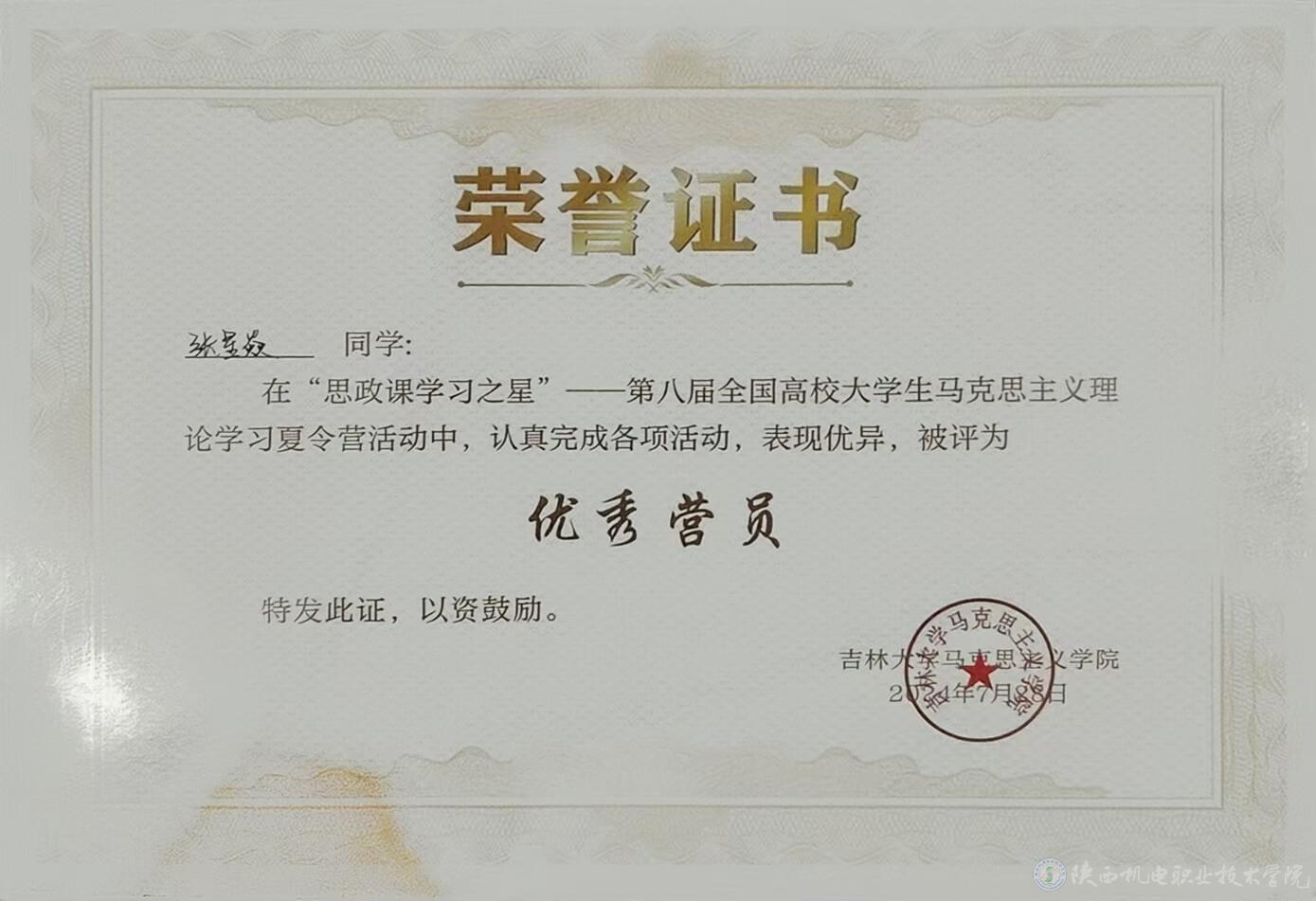 7月21—28日,第八届全国大学生马克思主义理论学习夏令营在吉林省举行。经学校推荐、陕西省委教育工委遴选,买球赛的app官网铁道工程学院张星焱同学作为陕西省5名学生代表之一参加了本次活动并获“优秀营员”荣誉称号。