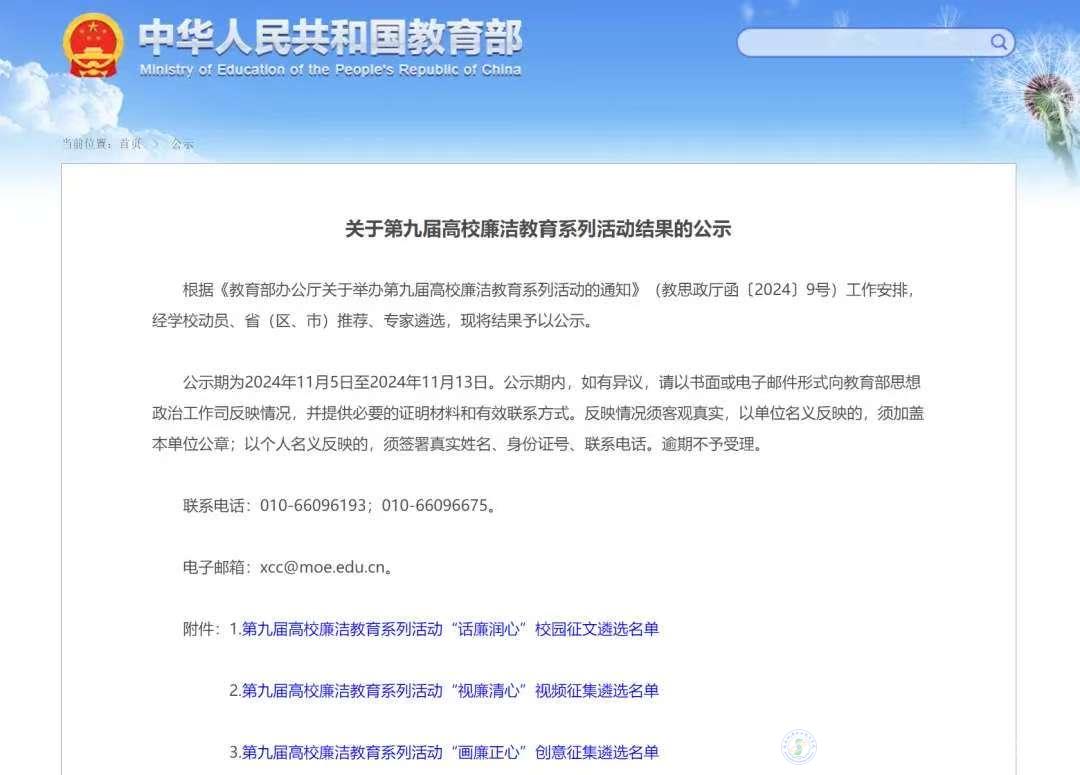 近日,由教育部思想政治工作司主办的“廉洁铸魂强根本 挺膺奋进建新功”——第九届高校廉洁教育系列活动评选结果公布,我校选送的《清风正气满校园 廉洁之花绽心间》入选全国高校“话廉润心”校园征文遴选名单,这也是陕西高职院校唯一一篇获此殊荣的征文。