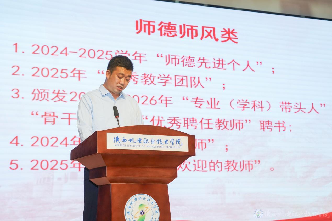 人事处处长姜有奇宣读2024—2025学年“师德先进个人”、2025年“优秀教学团队”、2025年“最受学生欢迎的教师”、2024年“优秀青年教师”、评聘2025至2026年“专业(学科)带头人”“骨干教师”“优秀聘任教师”表彰文件。