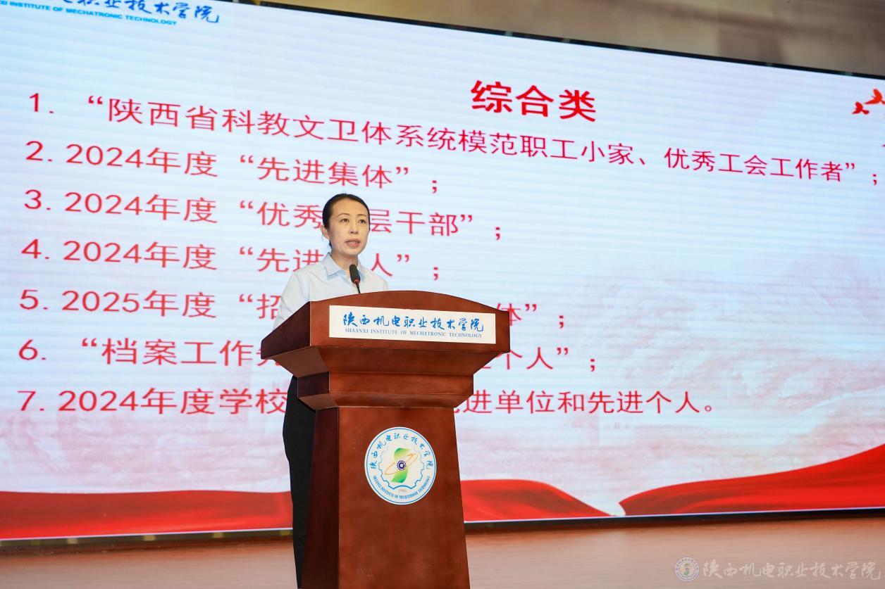党政办公室主任康健宣读“陕西省科教文卫体系统模范职工小家、优秀工会工作者”、2024年度“先进集体”、2024年度“优秀中层干部”、2024年度“先进个人”、2025年度“招生工作先进集体”“档案工作先进集体和先进个人”、2024年度学校统计工作先进单位和先进个人表彰文件。