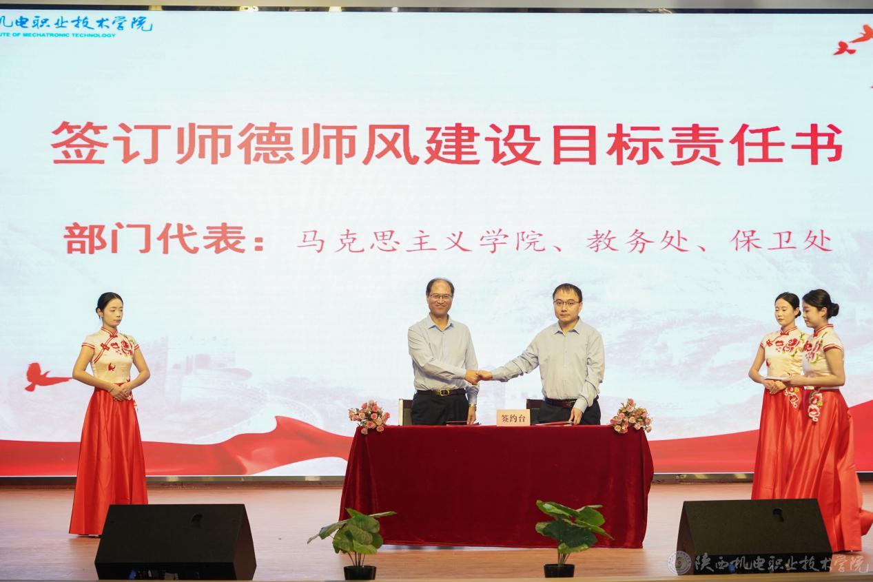 伊逊智与马克思主义学院王康、教务处白娟娟、保卫处常小凯签订师德师风建设目标责任书,并颁发《师德师风制度汇编》《违反教师职业行为十项准则的典型案例手册》。