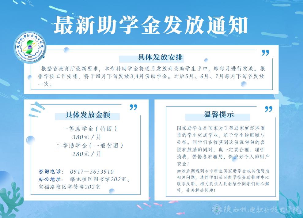 根据省教育厅最新要求,本专科助学金将逐月发放到受助学生手中,即每月进行发放。根据学校工作安排,将于四月下旬发放3,4月份助学金。之后5月、6月、7月每月下旬各发放一次。