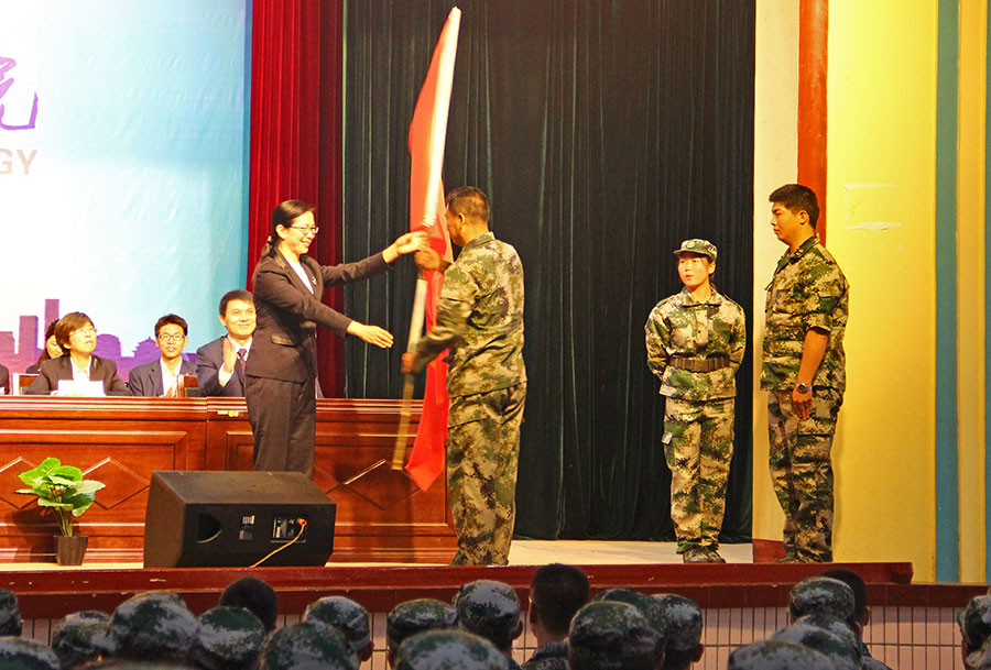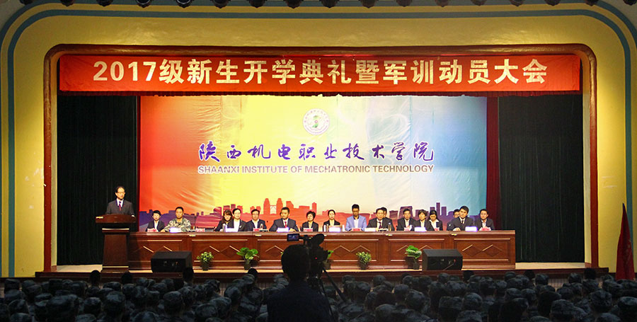副院长张琴同志对向本次学院军训承训单位——宝鸡市秦岭学生军训基地授军训团旗,最后,伊逊智同志宣布2017级高职新生军训开始,开学典礼暨军训动员大会在热烈的掌声中圆满结束。