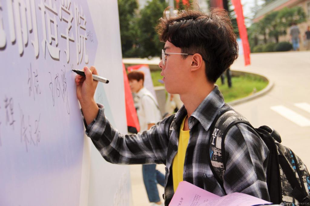 迎新工作有序展开,书写着“热烈欢迎新同学”的空飘气球,高高耸立在学院南门广场,道路两旁彩旗迎风招展,新生签名墙前驻足着留影的新生和送行家人。校园内随处可见书写着不同迎新寄语的横幅、喷绘,表达着对新同学的热烈欢迎与祝贺,营造着浓厚的开学氛围,成为迎新工作中一道亮丽的风景线。