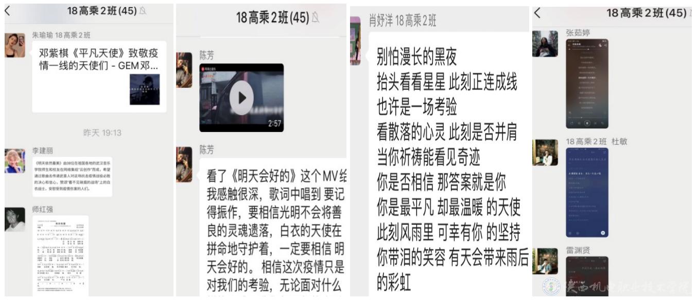 班级讨论群里学生纷纷发来自己完成的音频,一首首动听的歌曲表达了对战疫一线工作人员深深的敬意,以及战“疫”必胜的坚定信心。声乐课堂通过学习抗疫歌曲,讴歌了众志成城战疫情的磅礴力量。