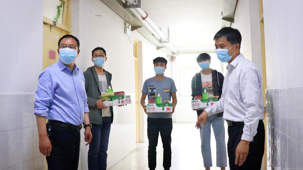 5月18日上午,学院党委副书记、院长向纪明,副院长张新堂一行前往隔离留观区,看望并亲切慰问了被隔离的同学们,学生处处长王建斌陪同。