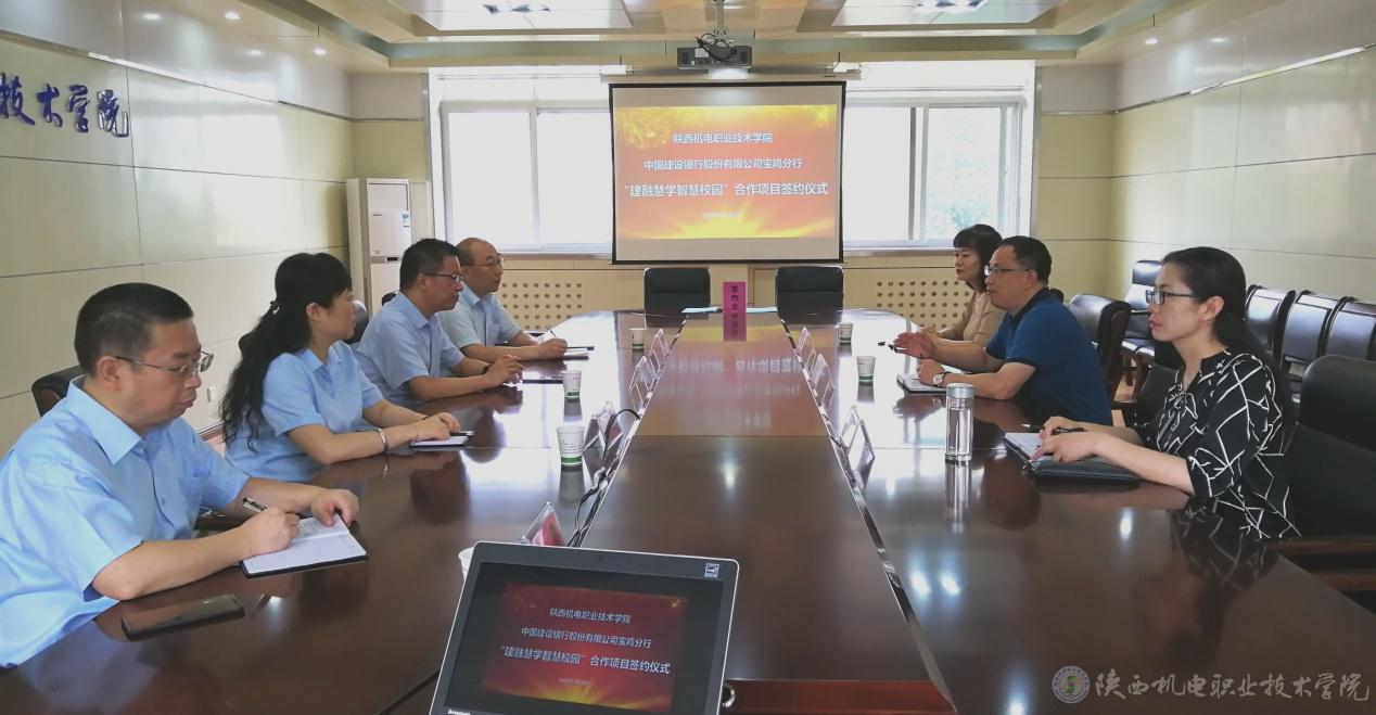 7月16日下午,我校与中国建设银行宝鸡分行“建融慧学智慧校园”签约仪式在行政楼三楼西会议室举行。中国建设银行股份有限公司宝鸡分行行长畅成会一行与党委副书记、院长向纪明,副院长张琴共同参加签约仪式。签约仪式由财务处严炜主持。