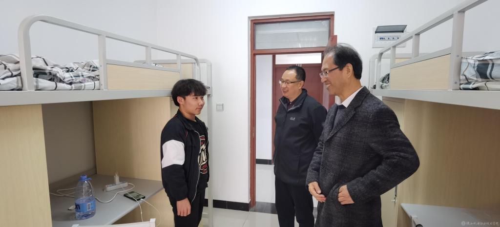 党委书记伊逊智(右)、院长向纪明(中)深入学生公寓与已报到学生交谈