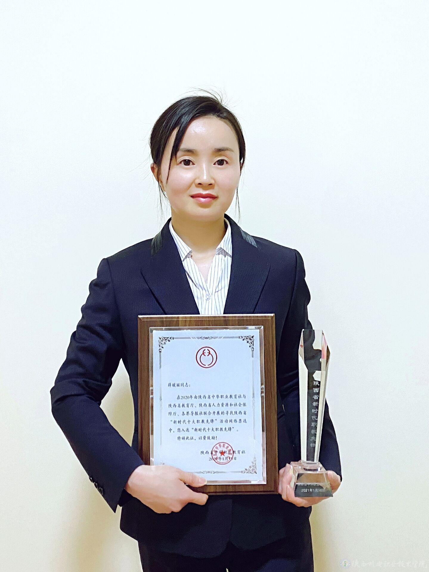 陕西省中华职教社2020年联合陕西省教育厅、省人力资源厅和社会保障厅及各界导报社开展了寻找陕西省“新时代十大职教先锋”活动,于2021年1月15日总结会中进行了表彰,我校智能制造学院教师薛媛丽获评“新时代十大职教先锋”荣誉称号。