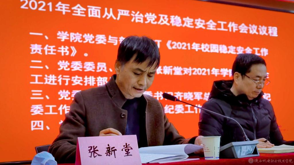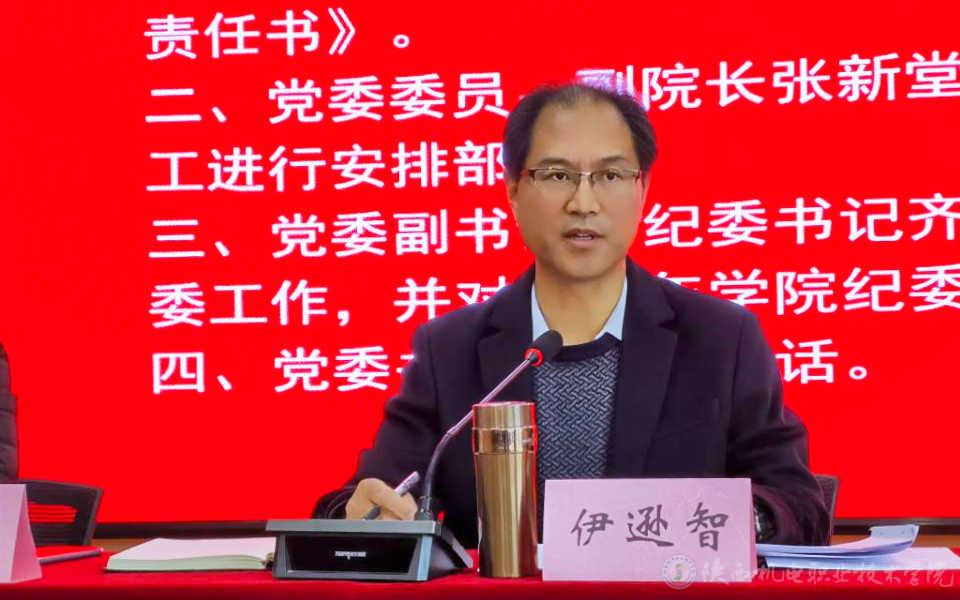 伊逊智就深入贯彻落实贯彻落实2021年陕西教育系统全面从严治党及稳定安全工作会议精神,切实做好学校2021年全面从严治党及稳定安全工作进行讲话,并提出三点要求:一是坚持政治学习,提高政治站位,坚定高质量发展方向;二是坚持从严治党,抓好稳定安全,营造高质量发展氛围;三是坚持领导带头,发扬优良作风,保持高质量发展定力。希望大家以高度的政治责任、饱满的工作热情和优良的工作风,抓紧抓实全面从严治党和稳定安全工作,不断推进内部治理体系和治理能力现代化,不断提升办学综合实力和人才培养质量,全面推动学院各项事业高质量发展,以优异成绩迎接和庆祝中国共产党成立100周年。