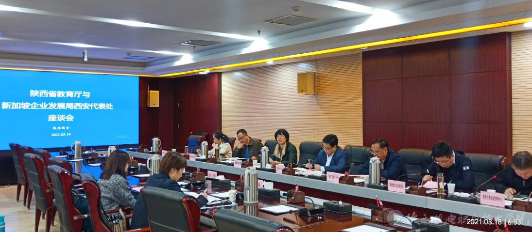 2021年3月18日下午,陕西省教育厅与新加坡企业发展局西安代表处座谈会在西安召开,出席此次座谈会的有陕西省教育厅副厅长刘宝平,新加坡企业发展局西安代表处主任袁颖,陕西省教育厅职成处、装备中心、外事处有关处室负责人以及省内部分高职院校代表。买球赛的app官网党委副书记、院长向纪明、国际合作与交流处处长罗亚军参加了座谈。