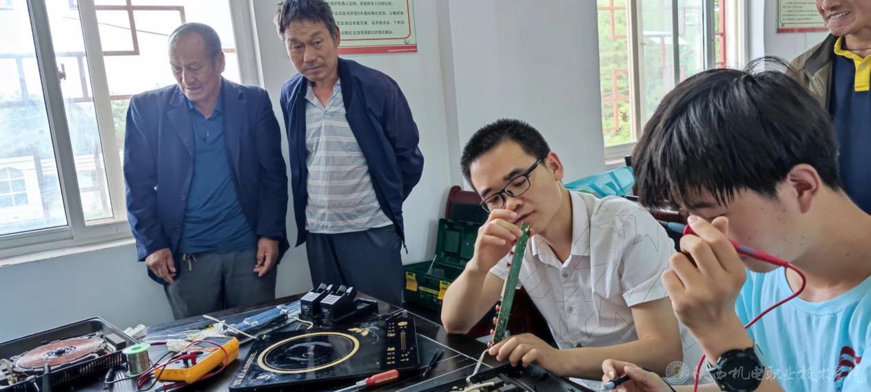 电子与信息学院的志愿者们在老师们的带领下,组织开展“家电维修”实践活动,他们分工明确、团结协作,为村民们维修家里电水壶、电饭煲、电风扇等家用电器,拿着万用表、焊笔等专业工具,细致耐心地开始检测、维修,让一件件小家电“重获新生”。虽然7月的烈阳炎热无比,但丝毫没有影响到志愿者们为民服务的心意,个个都在专心做着自己手中的事情。