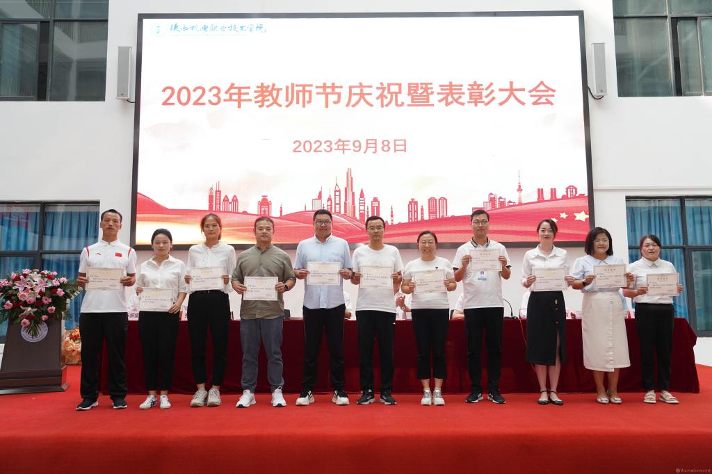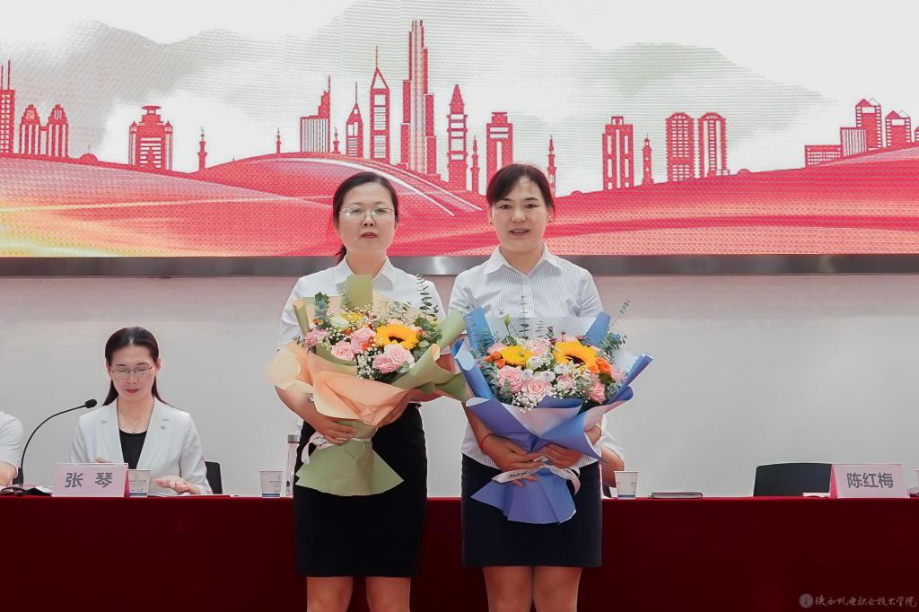 党委副书记张琴同志宣读《陕西省教育厅关于表彰第十三届陕西高职院校教学名师奖获奖教师的通知》并授予鲜花;宣读2022年度“先进集体”,2023年度“招生工作先进集体”表彰文件并颁奖。