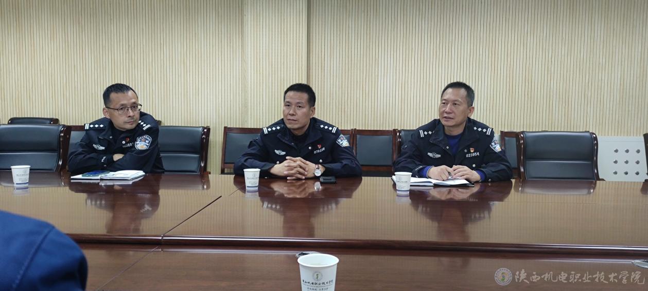 陈峰从师生安全教育、隐患排查、网络安全管理、学生管理、反诈宣传、毕业季学生管理、社团管理、常态化值班巡逻等八个方面向公安局领导详细汇报了我校安全管理的工作情况、亮点及成效。并且表示保卫处积极落实学校文件精神,联合金台分局对校园重点人群进行摸排排查。