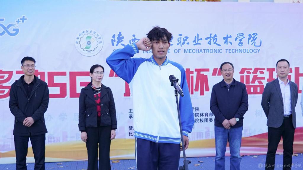 体育部教师姚康华、23机电一体化2班学生穆再排尔·芒力科分别代表全体裁判员、运动员宣誓,确保比赛公平、公正。