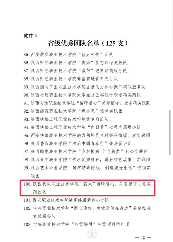 近日,中共陕西省委宣传部、中共陕西省委文明办、中共陕西省委教育工委、共青团陕西省委、陕西省学生联合会对2023年全省大中专学生志愿者暑期文化科技卫生“三下乡”社会实践活动先进集体和个人进行了通报表彰。我校“薪火”情暖童心,关爱留守儿童实践团队获评“省级优秀团队”,李妙桐同学荣获“省级先进个人”