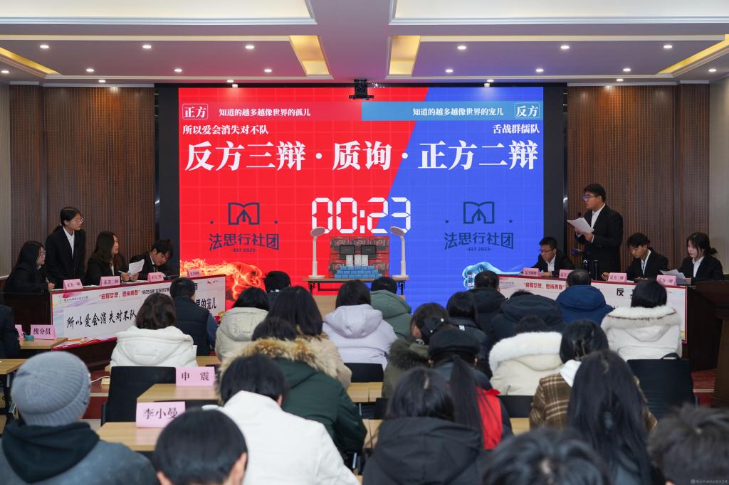 在庄严的国歌声中迎来了本届辩论赛的重磅环节——冠军争夺赛。本次冠军争夺赛的辩题由全校近500余名师生参与投票选出,来自电子信息学院的“所以爱会消失对不对”辩论队与来自铁道工程学院的“舌战群儒”辩论队围绕“知道的越多越像世界的宠儿还是孤儿”展开激烈辩论。经过立论、质询驳辩、质询小结、自由辩论、总结环节的激烈对战,现场气氛热烈,观众对选手提出自己的疑问,评委老师对选手的表现作出高度评价与点评。各位辩手表现出色,观众被他们良好的风范、出色的口才、严密的逻辑、敏捷的思维打动,场上热烈掌声不断。最终“所以爱会消失对不对”辩论队以3分的微小差距赢得本次校园辩论赛的冠军。