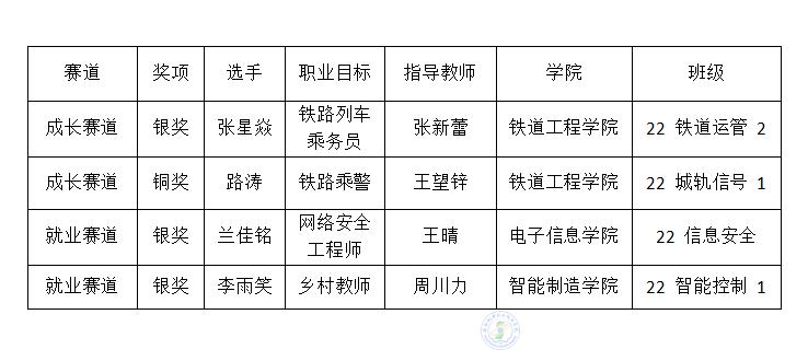 1月12-13日,在首届全国大学生职业规划大赛陕西赛区总决赛的比赛中,我校4名入围省赛选手喜获银奖3项、铜奖1项的好成绩。22铁道运管2班张星焱获职教组成长赛道银奖,铁道工程学院22城轨信号1班路涛获职教组成长赛道铜奖;电子信息学院22信息安全班兰佳铭获职教组就业赛道银奖;智能制造学院22智能控制1班李雨笑获职教组就业赛道银奖。