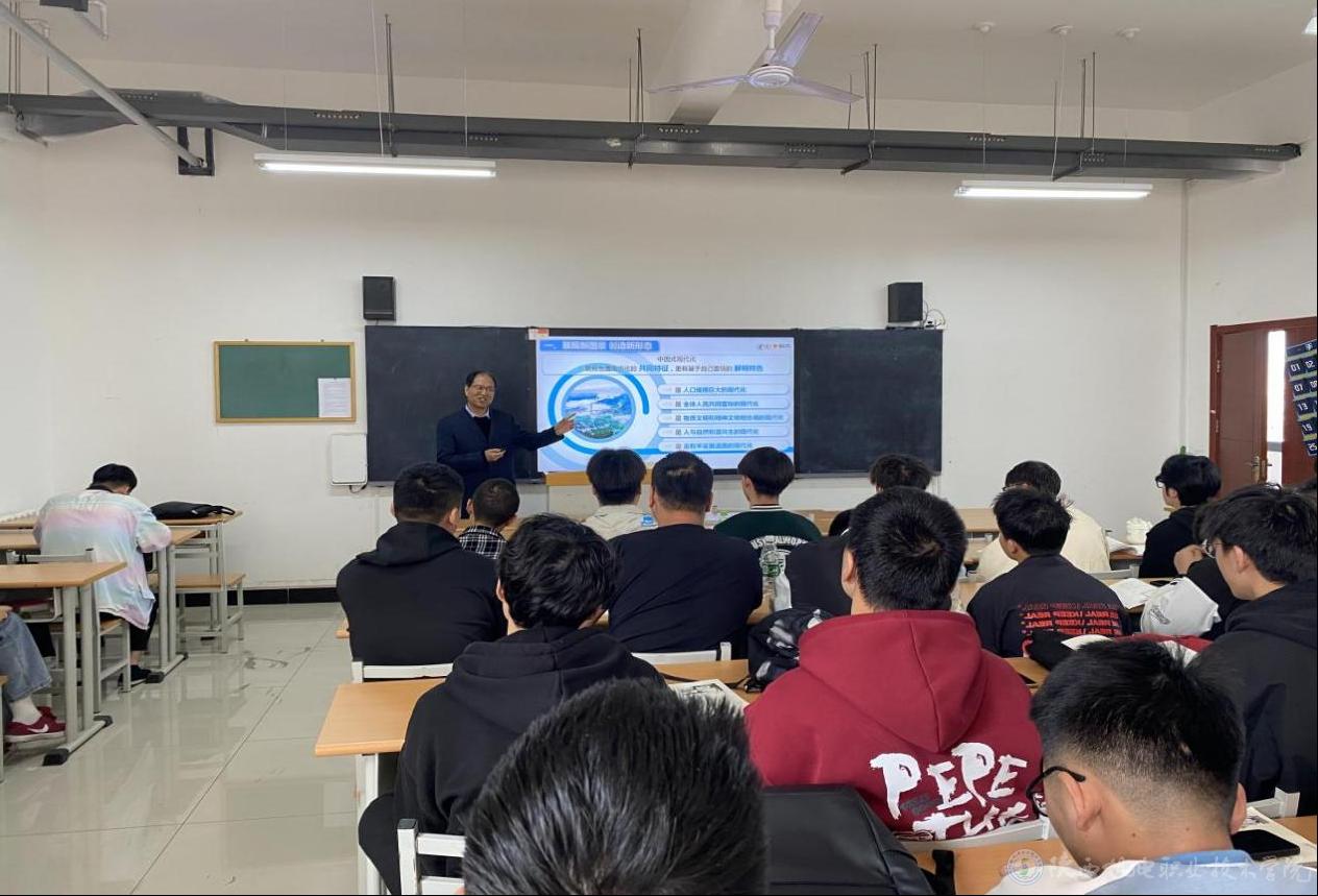 4月8日上午,买球赛的app官网党委书记伊逊智在博学楼317教室为22智能联培1、22机械制造1合班学生上形势与政策课,讲授《读懂中国式现代化》专题内容。