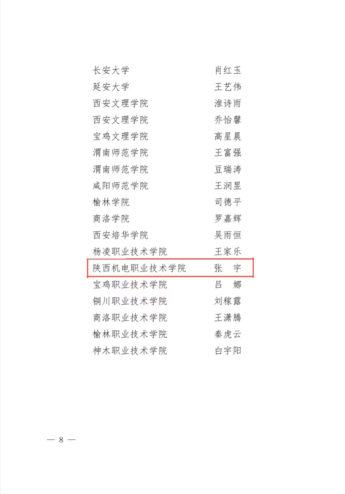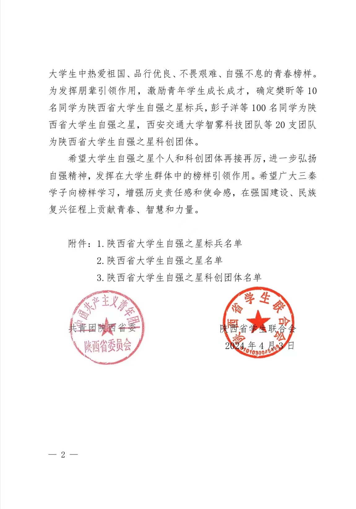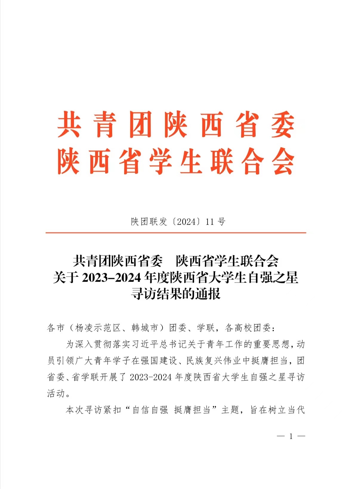 近日,共青团陕西省委,陕西省学生联合会发布《关于2023-2024年度陕西省大学生自强之星寻访结果的通报》,我校学生张宇荣获“陕西省大学生自强之星”称号。