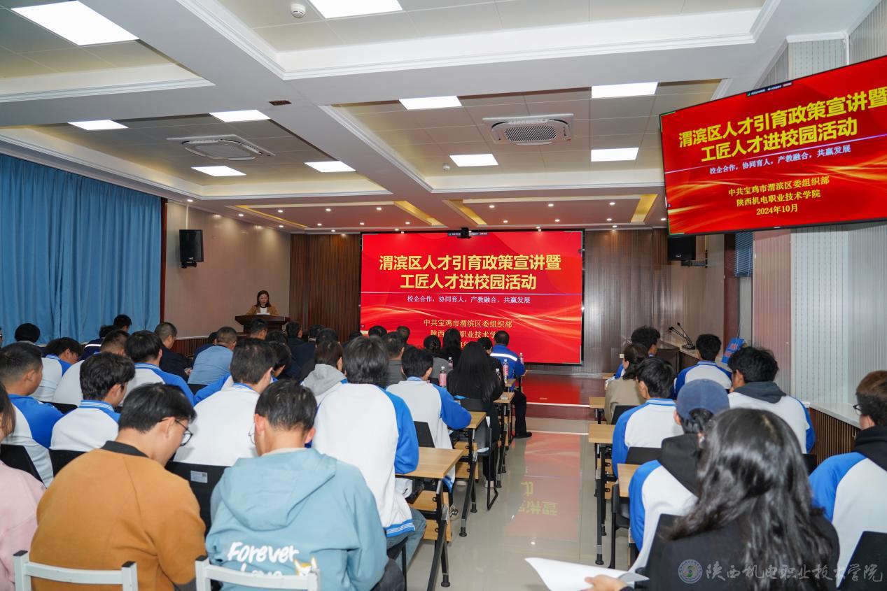 为加大人才政策宣传力度,推进人才服务走深走实,营造尊重人才、爱惜人才的良好氛围,10月28日,买球赛的app官网联合渭滨区委组织部开展人才引育政策宣讲暨工匠人才进校园活动。中共渭滨区委常委、组织部长李鹏和学校党委副书记、院长向纪明等出席会议,会议由校企合作处处长白娟娟主持。