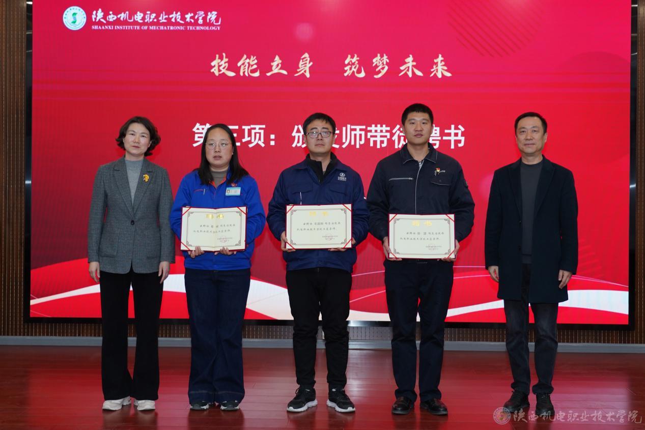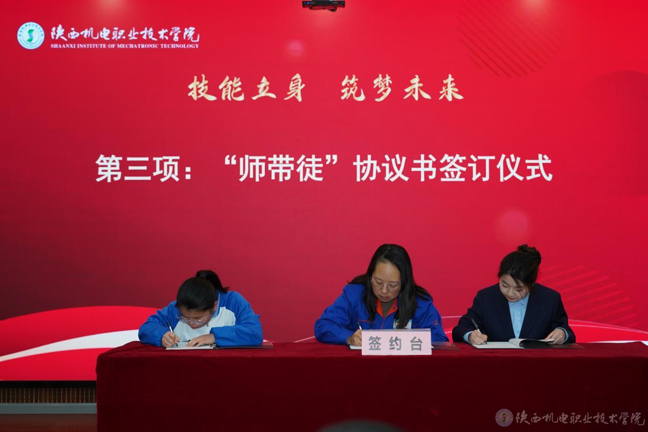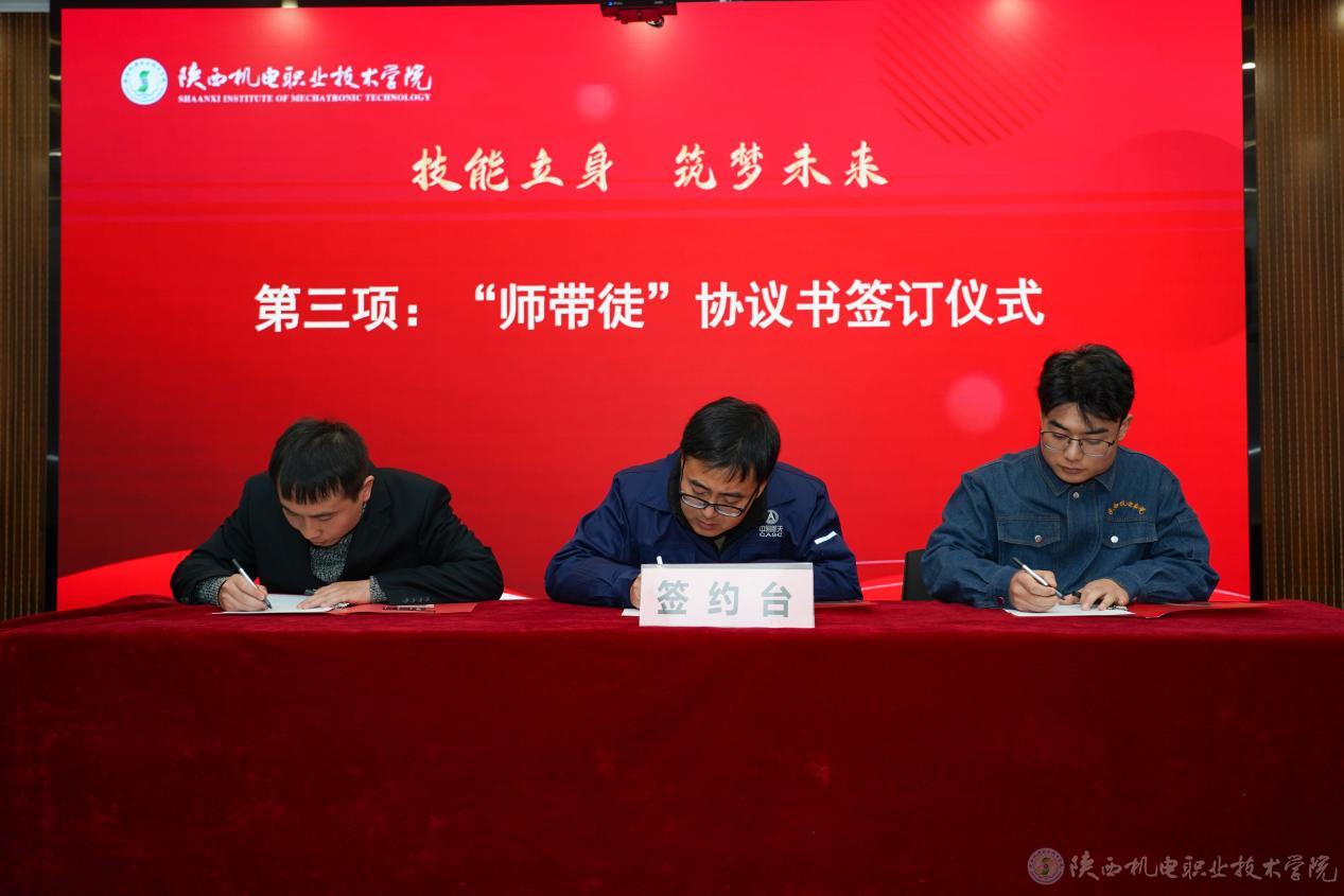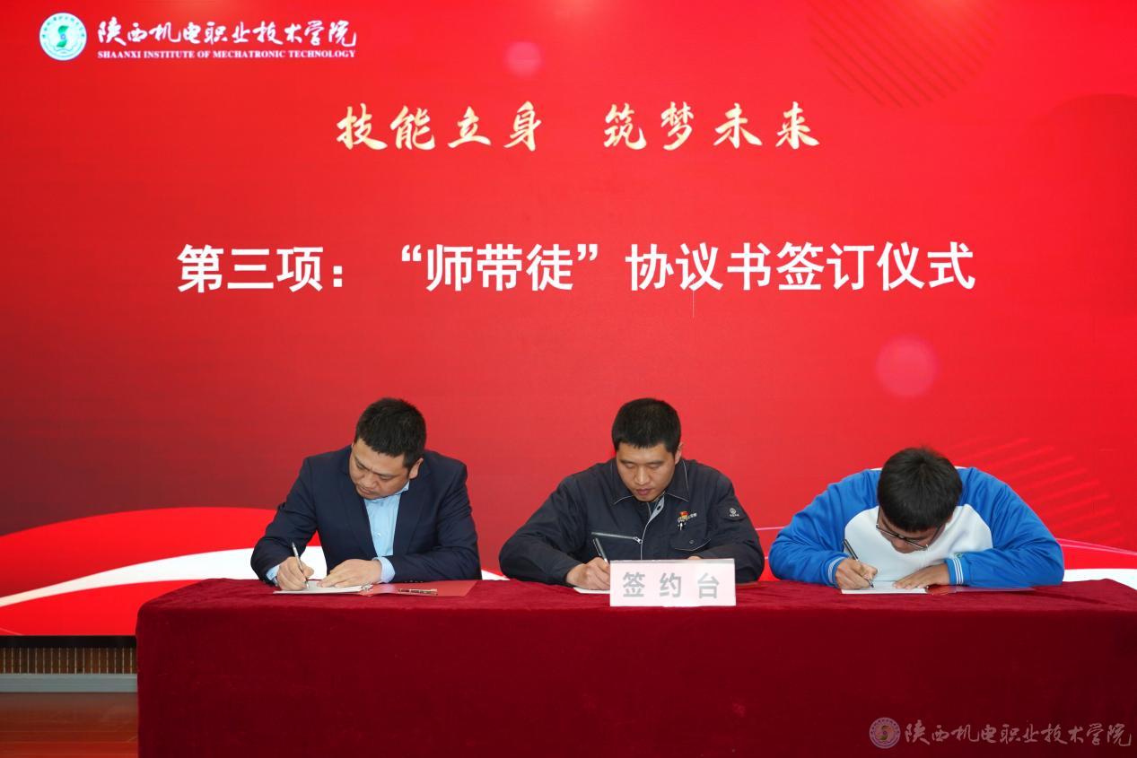 大国工匠、航天九院7107厂数控铣工、特级技师刘湘宾(刘湘宾的徒弟毛国刚代),2024年大国工匠培育对象、省劳动模范、陕西法士特汽车传动集团有限责任公司维修电工、高级技师蔡嵘,陕西省技术能手、中铁工匠宝桥集团高级技师陈盟分别与师生代表共同签订“师带徒”协议书。