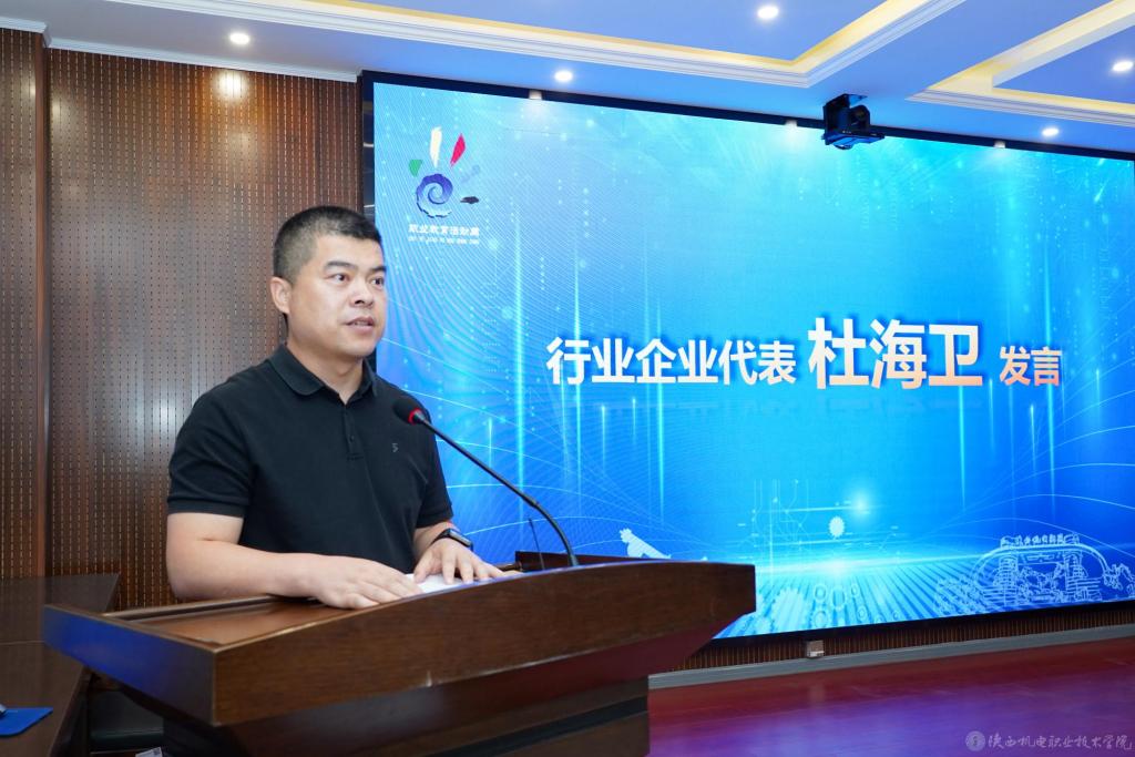 渭滨区互联网产业园党总支书记、宝鸡市民营企业协会副会长兼秘书长、宝鸡华信诚电子科技有限公司总经理杜海卫在发言中高度认可我校在产教协同育人中的实践成果,指出校企共建产业学院是深化职业教育改革的重要路径。