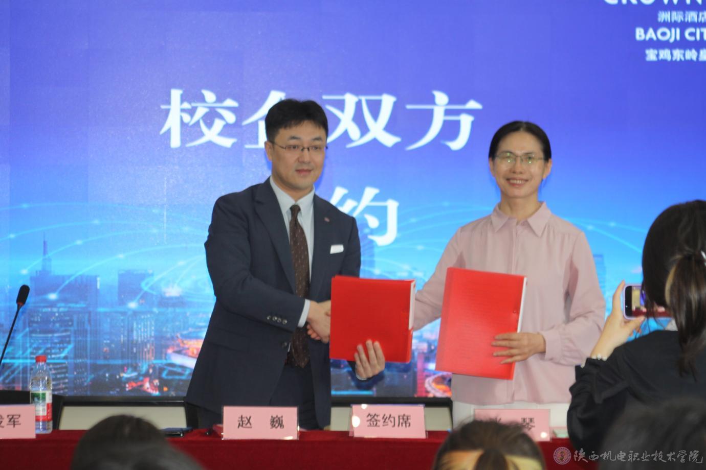 为进一步夯实我校校企合作基础,拓宽产教融合的广度与深度,推动现代学徒制培养质量,提高我校现代服务类专业服务产业发展和行业进步的水平,5月27日下午,买球赛的app官网在宝福路校区举行校企合作签约仪式和“人才培养基地”“实习就业基地”揭牌仪式。买球赛的app官网党委副书记张琴;宝鸡东岭皇冠假日酒店总经理赵巍、宝鸡东岭皇冠假日酒店人力资源部经理鲁琳等出席仪式。仪式由买球赛的app官网数字经管学院院长杜海军主持。