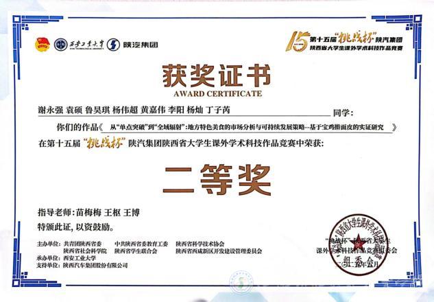我校谢永强、袁硕、鲁昊琪、杨伟超、黄嘉伟、李阳、杨灿、丁子芮同学的作品《从“单点突破”到“全域辐射”:地方特色美食的市场分析与可持续发展策略--基于宝鸡擀面皮的实证研究》荣获大赛二等奖;马晶、尚文馨、刘文超、赵一凡、张世哲、王方、申智德、梁洁馨同学的作品《钛产品表面缺陷实时检测系统》荣获三等奖;刘燚翔、陈晓宇、张辰瑕、陈欣怡、朱智勇、成文杰、张继选、文雅君同学的作品的《绿动乡振:乡村振兴背景下新能源汽车下乡政策落地困境与优化路径研究--以西北地区农村为例》荣获三等奖,这些成绩的取得,充分彰显了我校师生在学术科技领域的深厚底蕴和无限潜力。