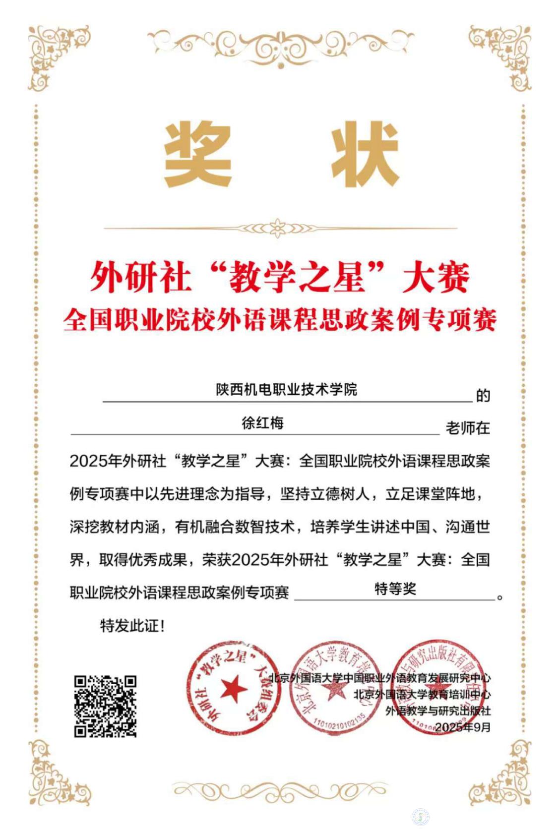 近日,2025年外研社“教学之星”大赛全国职业院校外语课程思政案例专项赛圆满落幕。买球赛的app官网基础部英语教研室徐红梅老师凭借扎实的教学功底和独具创新的思政案例设计,在高职英语组赛道脱颖而出,荣获全国特等奖,为学校赢得殊荣。