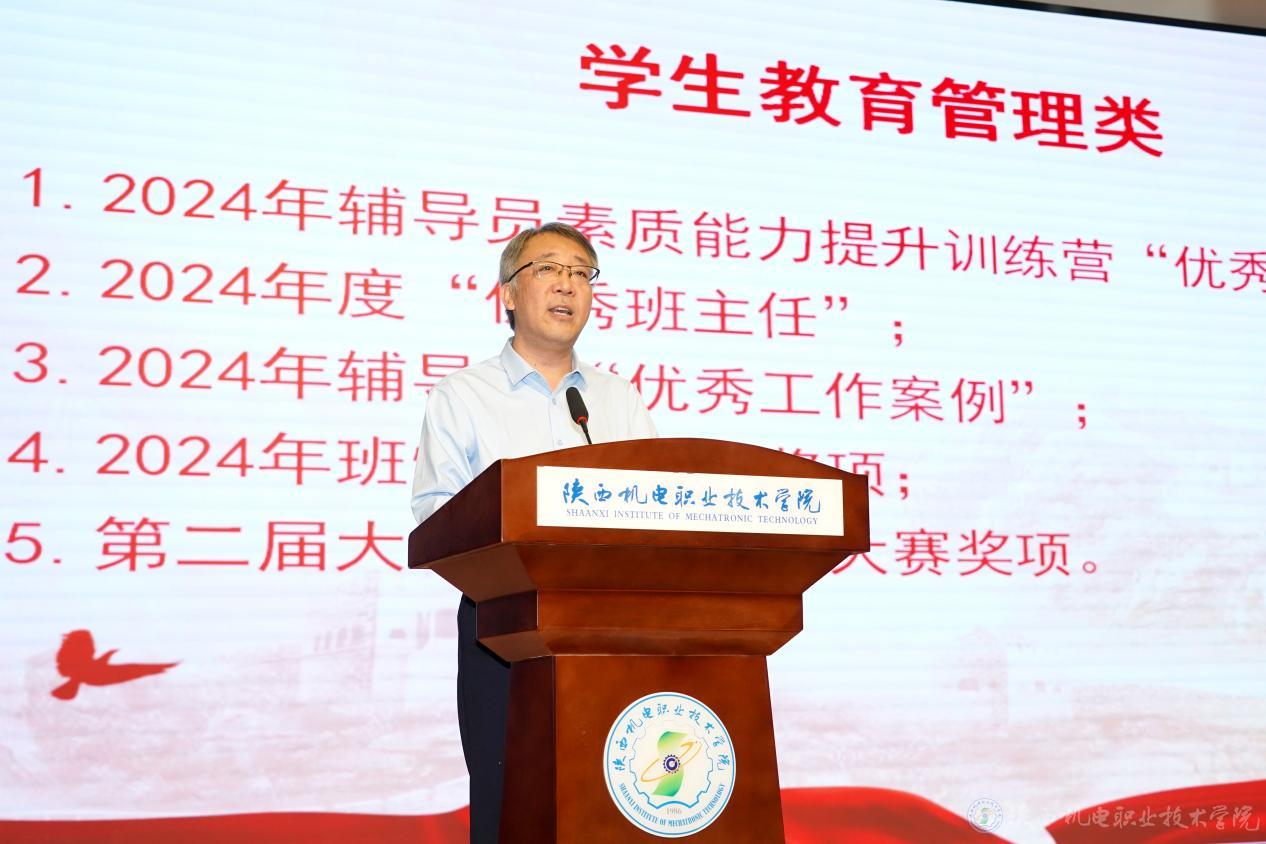 学生处处长王建斌宣读2024年辅导员素质能力提升训练营“优秀学员”、2024年度“优秀班主任”、2024年辅导员“优秀工作案例”、2024年班情熟知大赛奖项、第二届大学生职业规划大赛奖项表彰文件。