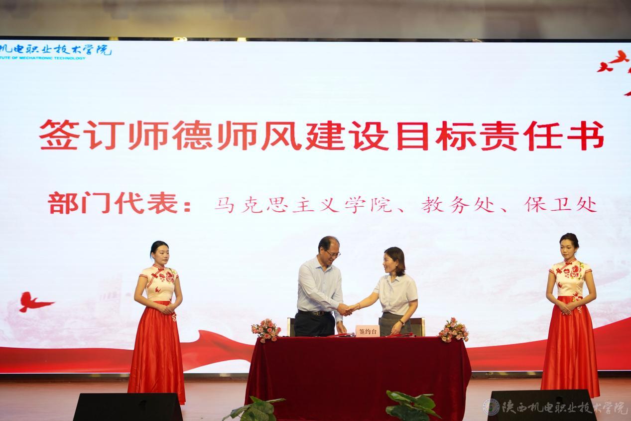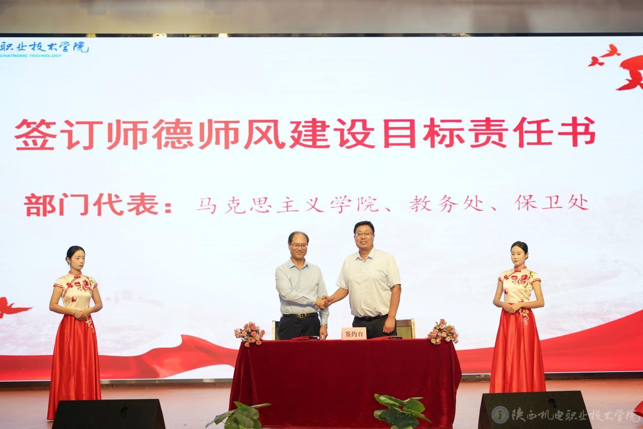 伊逊智与马克思主义学院王康、教务处白娟娟、保卫处常小凯签订师德师风建设目标责任书,并颁发《师德师风制度汇编》《违反教师职业行为十项准则的典型案例手册》。
