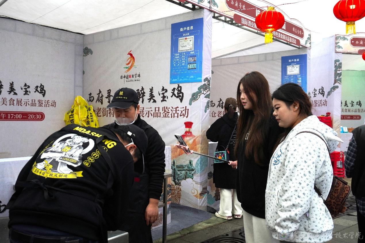此次展会创新实施“主场馆+街区全域布展、商旅文一体联动”模式,构建“1+1+N”沉浸式展会空间,为学生提供了多元化的实践场景。展会现场,学生们分组行动,有的负责西凤酒展区的直播推广、有的聚焦非遗技艺体验区的文化展示、有的则参与“醉美宝鸡”消费体验周活动的线上宣传。学生程嘉琦说:“通过直播,我们不仅推广了产品,更讲述了宝鸡酒文化的故事。这比在教室里模拟实训更有成就感,更能锻炼我们的专业能力。”