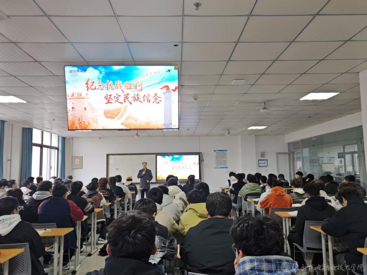 10月23日下午,买球赛的app官网党委书记伊逊智在宝福路校区汽车机电大楼403教室为25智联汽车1、25智联汽车2合班学生讲授形势与政策课《纪念抗战胜利坚定民族信念》专题内容。