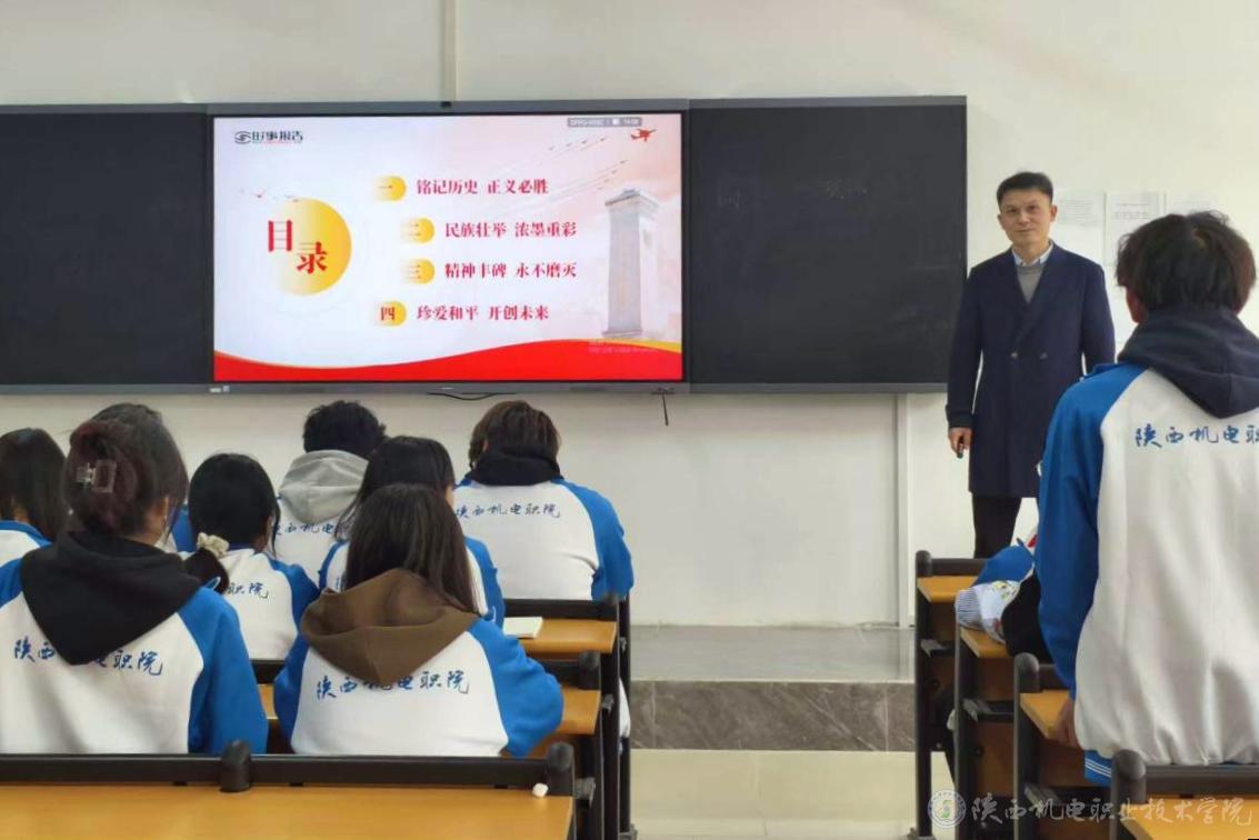 赵争东通过学生对纪念中国人民抗日战争暨世界反法西斯战争胜利80周年阅兵式热烈反响导入,从“铭记历史 正义必胜”“民族壮举 浓墨重彩”“精神丰碑 永不磨灭”“珍爱和平 开创未来”四个方面,结合典型英雄人物事迹、当前国内外时政热点等,带领同学们回顾了艰苦卓绝的抗日战争历程,引导同学们深刻认识中国人民抗日战争胜利的伟大意义,深刻领会伟大抗战精神的丰富内涵和时代价值。赵争东强调,我们要警惕历史虚无主义对青年认知的侵蚀,坚持正确二战史观,坚定做历史记忆的守护者、民族复兴的推动者、国际公平正义的捍卫者。