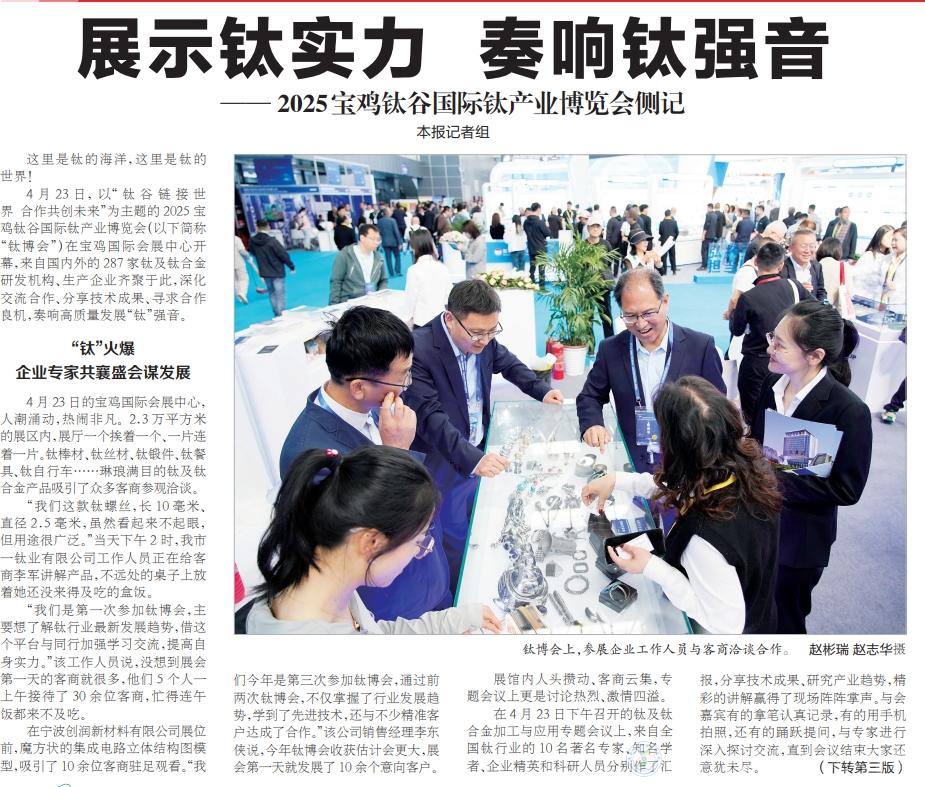 4月23日,以“钛谷链接世界合作共创未来”为主题的2025宝鸡钛谷国际钛产业博览会(以下简称“钛博会”)在宝鸡国际会展中心开幕,来自国内外的287家钛及钛合金研发机构、生产企业齐聚于此,深化交流合作、分享技术成果、寻求合作良机,奏响高质量发展“钛”强音。