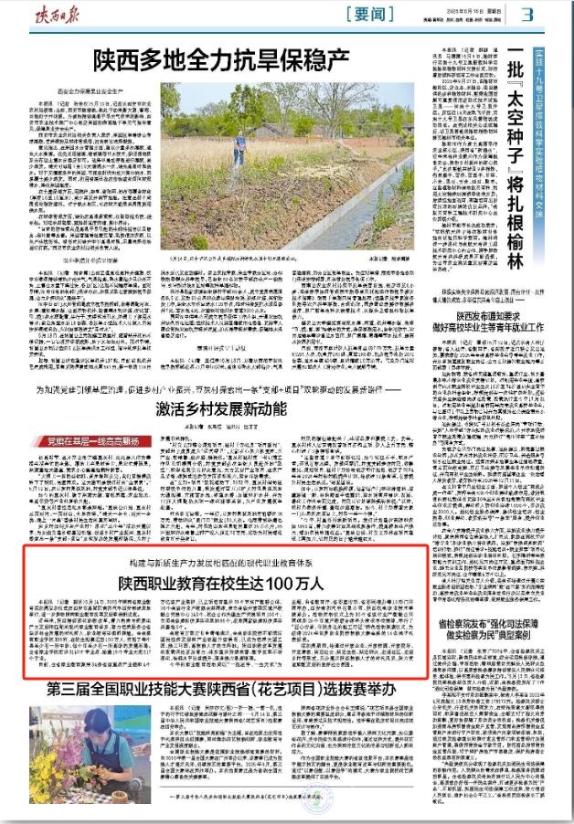 近年来,陕西持续深化职教改革,着力构建与新质生产力发展相匹配的现代职业教育体系,努力培养服务全省经济社会发展的时代新人,职业教育实现新跨越。全省现有职业学校389所,在校生规模达到100万人,实现了每个县至少有一所中职、每个市至少有一所高职的发展布局。全省职业学校布设3142个专业点,涵盖19个专业大类517个专业。
