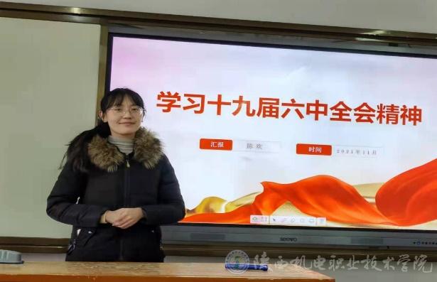 会议首先邀请马克思主义学院陈欢老师为全体与会党员做学习贯彻党的十九届六中全会精神专题报告。陈欢老师从党的十九届六中全会概况、公报内容和《历史决议》的创新与亮点等三个方面深刻解读了党的十九届六中全会精神的丰富内涵与核心要义,现场的同志们通过研学全会公报,从百年史诗中汲取智慧力量、品味精神甘露。