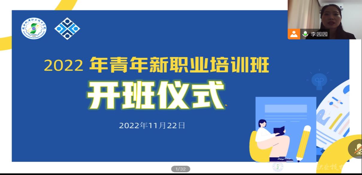 11月22日上午,“青年新职业”培训班正式开班,在开班仪式上,培训处处长何蒙辉从四个新职业的就业优势以及未来的展望做了阐述,并对参训学生提出了要求:希望学员们高度重视,珍惜本次提升技能的机会,并要学以致用,开拓就业新思路。担任本次培训项目的陕西卓越天成职业技能培训学校陈伟校长介绍了本次培训职业的具体内容、上课形式、课程时长,鼓励学员们在新经济转型期,抓住机遇开拓思路,珍惜机会,努力学习。线上会议主持由卓越天成培训学校李园园老师担任。